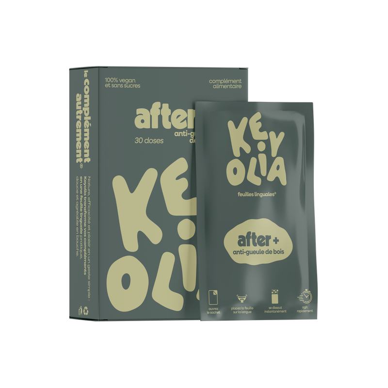 AFTER+ de Keyolia est un complément alimentaire sous forme de feuille linguale qui se dissout rapidement sur la langue, sans besoin d'eau. La formule SOS du lendemain, une feuille qui réveille, soulage et rafraîchit.